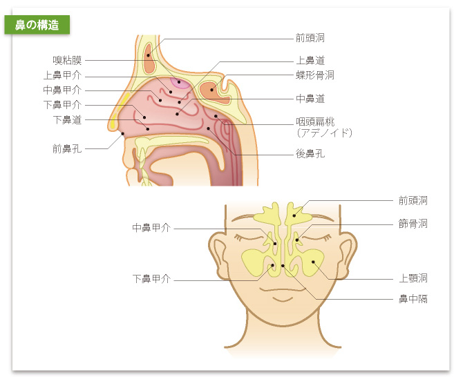 鼻や目の周囲の顎骨の中には、副鼻腔と呼ばれる骨の空洞がいくつか存在します。副鼻腔は鼻と繋がっており、アレルギーや風邪をひいて鼻炎を起こすと副鼻腔にも鼻水が溜まったり、炎症が起こりますが、これにより頭重感や頭痛を生じることがよくあります。
