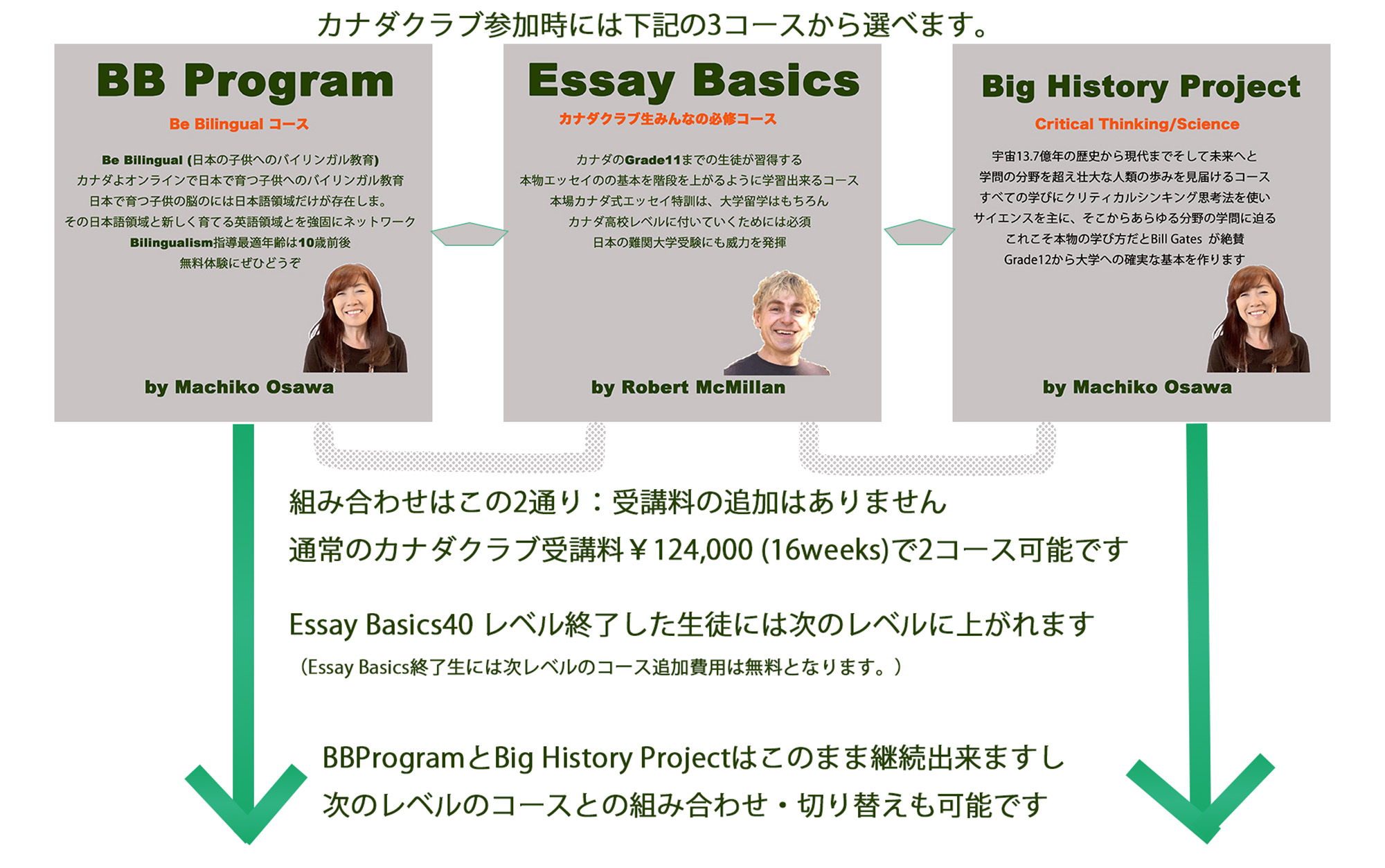 カナダのGrade6~11までが学ぶエッセイ基本を40レベルで学びます。カナダ留学には必須の基本能力です。論理的・客観的・具体的・批判的な思考過程(クリティカル・シンキング思考法)を実践で学べるエッセイ指導です。