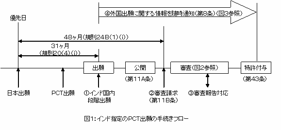 図1はインド指定のPCT出願の手続きを示した流れ図である。PCT出願によりインドで特許を取得するためには,優先日から31ヶ月以内にインドへ①国内段階出願を行う必要がある。次に,優先日から48ヶ月以内に②出願審査請求を行い,③審査報告対応(拒絶理由対応)を行う。審査報告対応においては,所定期間内に特許付与可能な状態にする必要がある。また,出願人は,特許が付与されるまで④外国出願に関する情報を長官に対して随時通知する義務を負う。以下の説明で参照する条文及び規則は,特に断りが無い限りインド特許法(2005年4月4日法律第15号改正)及びインド特許規則(2005年12月30日S.0.1844(E)号改正 2006年5月5日施行)である。