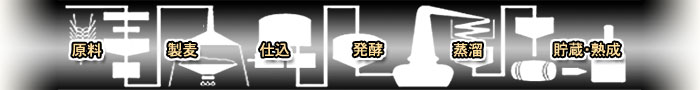 下図はウィスキーの製造工程ですが、先ず最初に案内されたのは樽に詰められたウィスキーの貯蔵・醸成倉庫です。