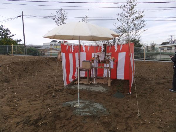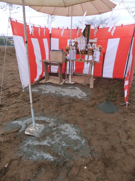 地鎮祭の始まる前には雨があがり、式典の最中には青空が見えてきました。