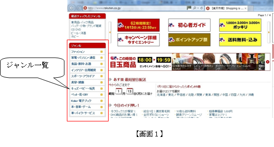 (1)楽天市場のトップ画面(画面1)の左側には、商品ジャンルの一覧が表示される。