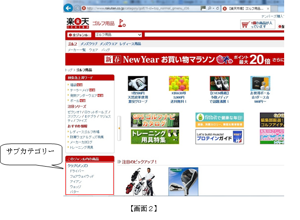 (2)ジャンルから一つを選択しクリックすると、選択したジャンルに含まれる商品のカテゴリー及びサブカテゴリーが表示される(画面2)。ここでは、「スポーツ・アウトドア」の「ゴルフ用品」を選択した場合の画面である。