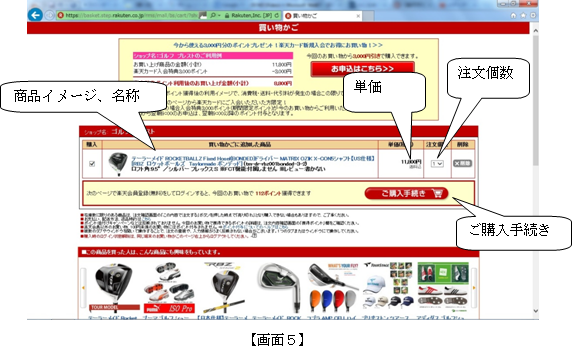 (5)「買い物かごに入れる」ボタンをクリックすると、最終的な注文確認画面が表示される。商品のイメージ、名称、単価、注文個数等が表示される。注文確認画面において、「ご購入手続き」ボタンをクリックすると、注文手続き画面(画面5)に遷移する。