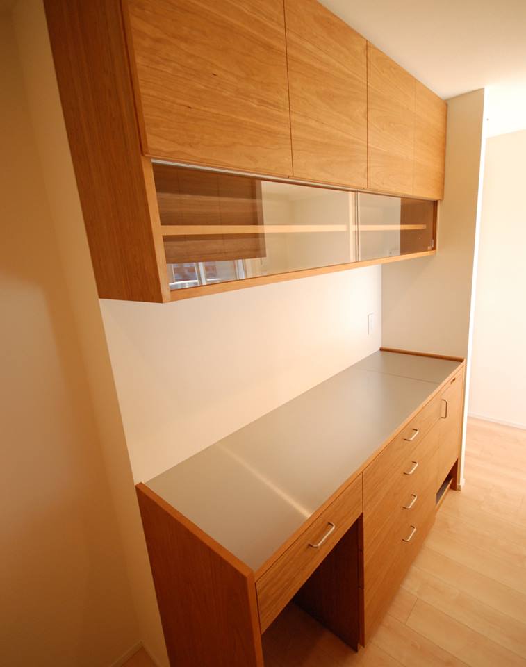 チェリー材を使って作らせて頂いた食器棚。いつもと印象が違うのは、ステンレスのシャープな印象と、ガラスの引き戸の軽快な印象です。