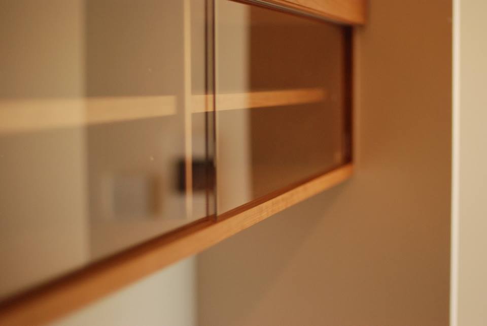 ガラスだけ、と言う印象を大切にしたかったので、そのレールには樹脂や金属のレールを用いずに、チェリー材をそのまま掘って溝を突いています。ですので、チェリーとガラスのとてもすっきりとした印象にまとまっています。