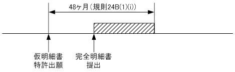 仮明細書による特許出願後,1年以内に完全明細書を提出した特許出願の審査請求は,図2に示すように仮明細書を添付した特許出願の日から48ヶ月以内に行わなければならない(第11条(2)(b),規則24B(1)(i))。ただし、仮明細書を取り消し、仮明細書に係る出願日を完全明細書の提出日へと後日付けにした場合(第9条(4),17条(1))、審査請求期限は完全明細書の提出日から48ヶ月になる。