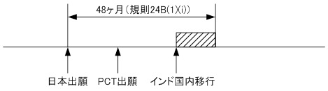 条約出願の審査請求は,図3に示すように優先日から48ヶ月以内に行わなければならない(規則24B(1)(i))。図3の場合,日本における特許出願日が優先日であり,審査請求の期限はインドにおける実際の出願日から48ヶ月では無く,優先日である日本の特許出願日から48ヶ月である。優先権主張の基礎が複数ある場合,最先の優先日が審査請求の起算日である。