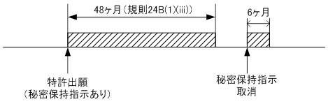 特許出願に係る発明が国防目的に関する発明として秘密保持の指示(第35条)が発せられている場合,当該特許出願の審査請求は,優先日若しくは出願日から48ヶ月以内,又は秘密保持指示の取消の日から6ヶ月以内の何れか遅い方にしなければならない(規則24B条(1) (iii))。図8は,特許出願日から48ヶ月経過後に秘密保持指示が取り消された場合の審査請求期限を示している。