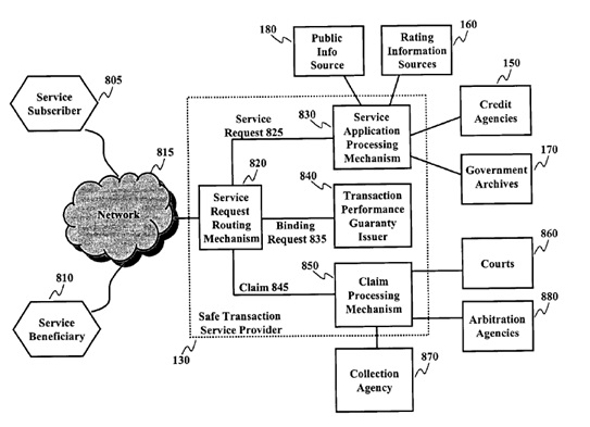 オンライン商取引のシステム開発を行うbuySafe(原告)はU.S. Patent No. 7,644,019(019特許) を所有している。019特許は、当事者のオンライン取引の実績保証を行う方法及び記録媒体をクレームしている。参考図1は019特許における実績保証の概要を示す説明図である。019特許は2003年4月21日に出願され2010年1月5日に登録された。