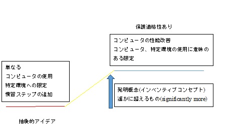 第2に、このような発明について、保護適格性の要件を満たすためには発明概念(インベンティブコンセプト)を付け加えなければならず、その程度も抽象的アイデアを遙かに超えるもの(significantly more)でなければならない。単にコンピュータを使用する、特定の技術分野に適用する、または単に慣習ステップを追加するだけでは不十分である。