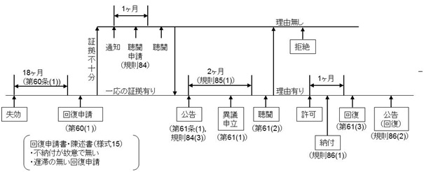 特許の回復申請手続きの流れを図4に示す。特許権者であった者は,特許の失効の日から18ヶ月以内に特許の回復の申請を行うことができる(第60条(1))。回復の申請は様式15により行い(規則84(1)),更新手数料の不納付に至った状況を詳細に説明した陳述書と,それを裏付ける証拠を添付しなければならない(第60条(3))。陳述書は,以下の事項を長官に納得させるものである必要がある(第61条(1))。
