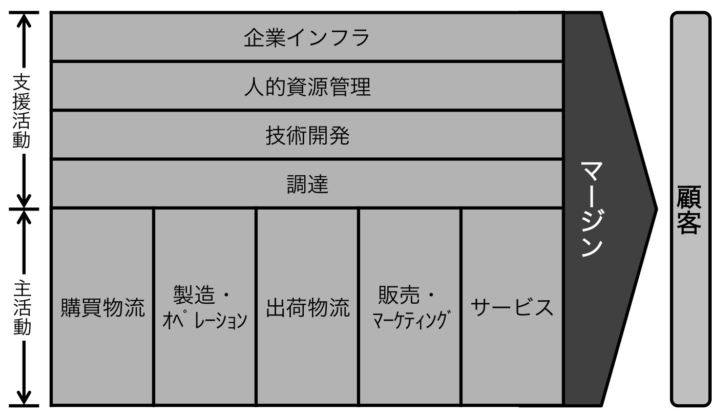 事業の競争優位性は、企業が提供する価値によってもたらされる。マイケル・E・ポーターは、「企業が提供する製品やサービスは、原材料から完成品まで取引される”流れ(連鎖)”に沿って価値が付加される」と提唱。この活動を分解し分析することで、競争優位の源泉を見つけられるとした。バリュー・チェーンは、価値の付加に関わる企業間および企業内の活動のつながりであり、主活動と支援活動の2つに分類される。