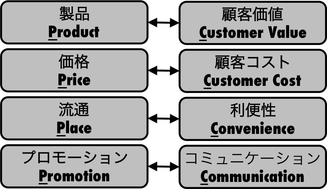 マーケティングミックスには、売り手の視点から、製品(Product)、価格(Price)、流通(Place)、プロモーション(Promotion)を考える「4P」と、お客様の視点から、顧客価値(Customer Value)、顧客コスト(Customer cost)、利便性(Convenience)、コミュニケーション(Communication)を考える「4C」がある。