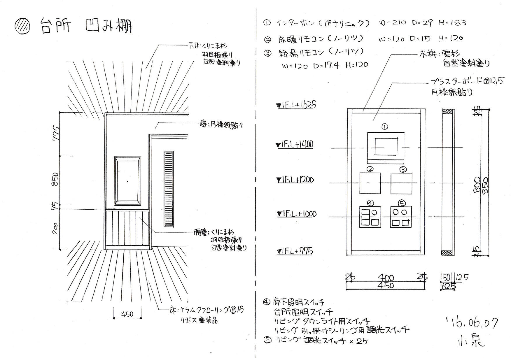 工事中の青梅市のK-HOUSEの凹み棚のスケッチです。壁を5cmくらい凹ませて絵のような額縁をつくり、そこにTVインターホン、床暖房リモコン、給湯リモコン、照明のスイッチ2つをまとめてレイアウトして設置します。
