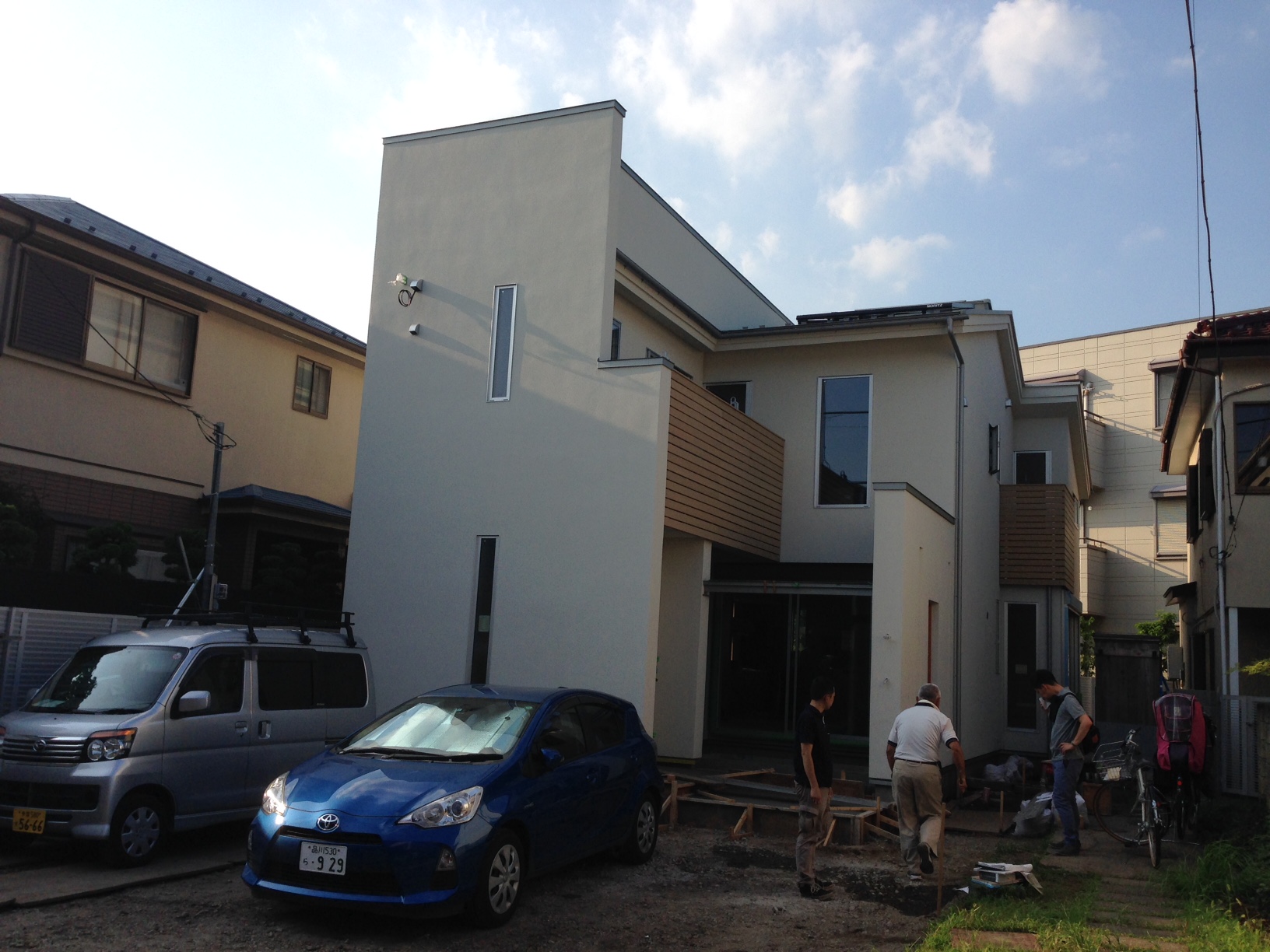 世田谷区成城で工事中のリブ格子天井の家 成城学園K-HOUSEの足場がとれました。光設計では珍しく真っ白い外壁の色です。外観のデザインも建築主さんの好みに合わせてコンクリートの建物のようなイメージにしています。