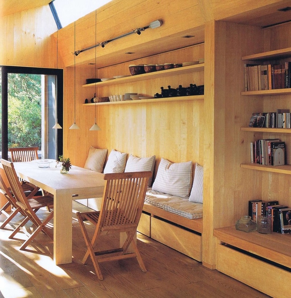 小さな家でも、収納家具と一体になったベンチをつくることで、小さなスペースに効果的に居場所をつくっています。