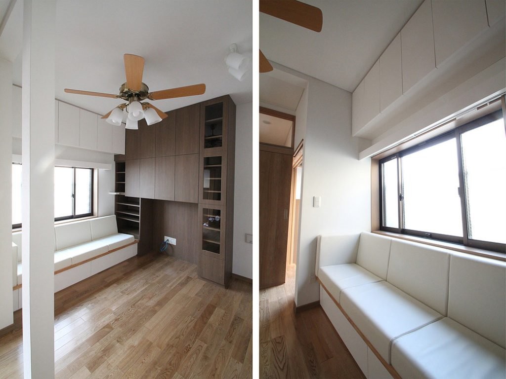 上部には棚をつくり、ソファの箱の中もモノが入るようにし、古い狭小住宅にそれまで無かった居場所をつくりました。