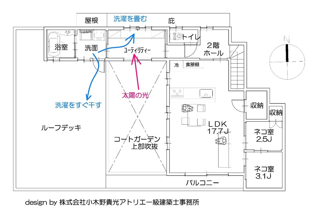 掲載した平面図は、ある家の設計をした時のプランです。このお宅は多数の猫ちゃん達と一緒に住む家だったのですが、見ていただきたいのはそこでは無く、洗面所と物干し場との関係。図面は2階です。洗面所にある洗濯機で洗濯した後、そのまま、ダイレクトにルーフデッキに出られます。階を跨ぐどころか、お勝手口を開けた隣がもの干し場になります。ほとんど移動する事無く、洗濯が干せますから、非常に便利です。人が歩いて動くルートを動線と言いますが、生活する上で洗濯などの日常の家事はこの動線を、可能な限りコンパクトにすることで、家事に便利な家になります。