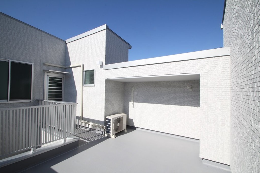 写真の住宅では、大きなルーフバルコニー・ルーフテラスをつくりましたが、この屋上のバルコニーにも、屋根をちょこんと掛けました。ちょっとしたコトですが、洗濯モノ干しに大変便利に使っています。