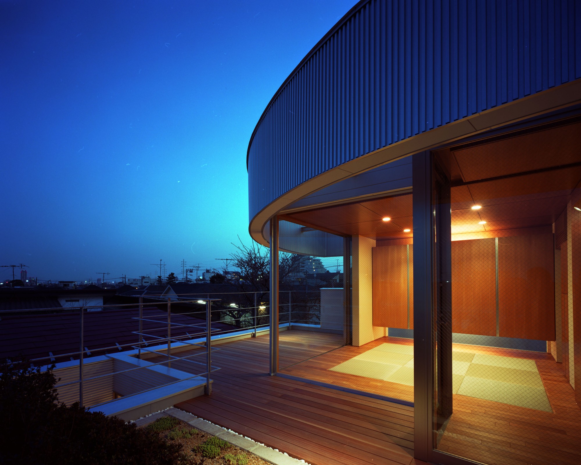 3階は、用途地域境界と斜線制限をかわした円形の中に和室空間をおさめ、視界の広がる南・東に向かってデッキ空間や庭園を設け、心が開放されるような場所にしました。