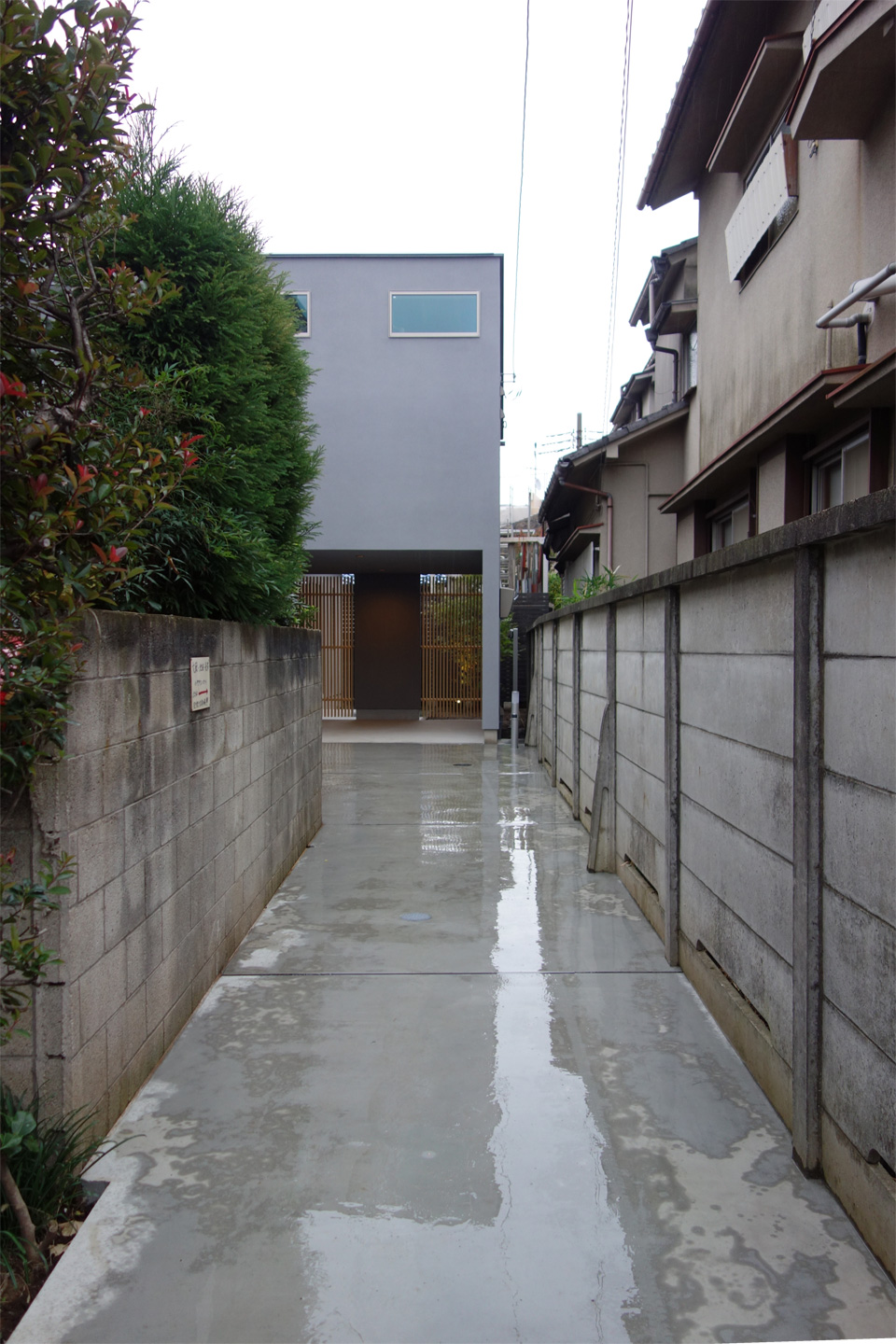 細い路地を進み、またその奥にある旗竿上の土地で、幅2mちょっとの長い路地の先に建物が建っています。