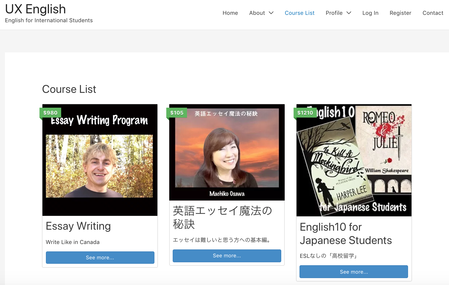 担当コースは[英語エッセイ魔法の秘訣] [English10 for Japanese Students] [English12 exams for Japanese Students]