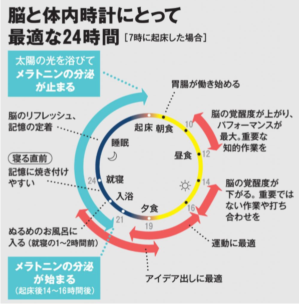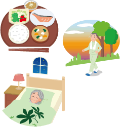毎日、定時に起床しましょう。「体内時計」が安定して機能するために最も大切な行動です。できれば「早寝早起き」が望まれます。