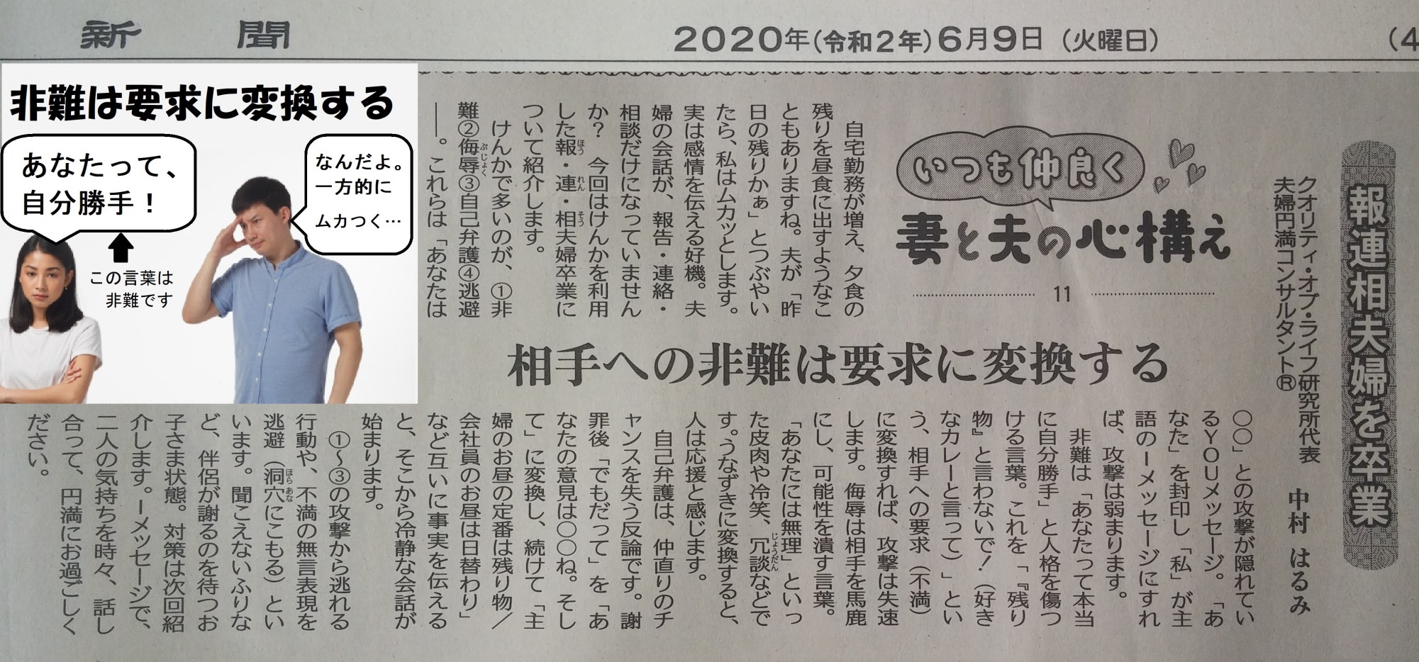 今日は、80万部発行の新聞連続コラムの11回目 「報連相夫婦卒業」です。