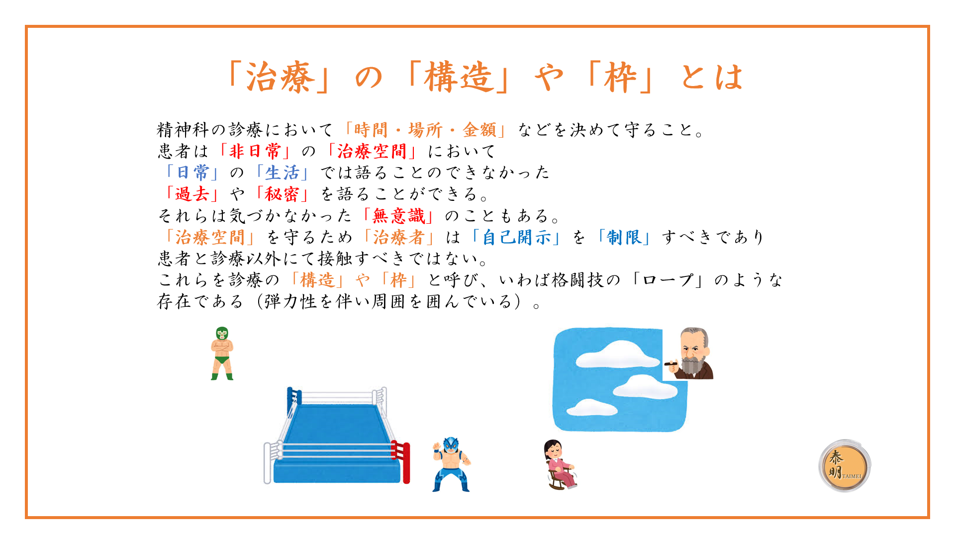 「精神科」の診療は内科や外科など「身体科」とは異なる「決まり」「ルール」があります。これを「治療」の「構造」や「枠」と呼びます。例えば、精神科の診療において「時間・場所・金額」などを決め、守らなければなりません。さらに、原則として患者さんの「身体に触れることはありません」(血圧測定や血液採取など身体測定などの例外を除き)。