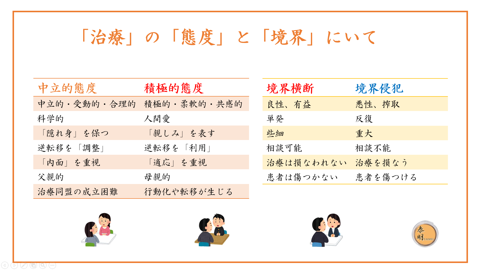 しかし「境界侵犯」(個人的関係)は禁じなくてはなりません。治療者は「特権」を利用し、患者さんを「搾取」することになります。患者さんもはじめ「特別扱い」されることに喜びを覚えるかもしれません。しかし、それは長く続くものではなく、いつしか治療の目的を見失うことになります。