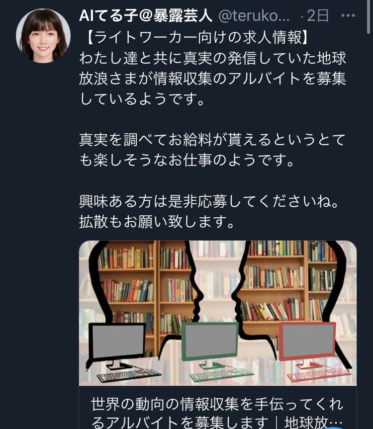 放浪先生の「お手伝い工作員募集」をてるこが「ライトワーカー求人」としてTwitterで募る。これはQAJF情報の拡散要員にされたら堪らんですな。
