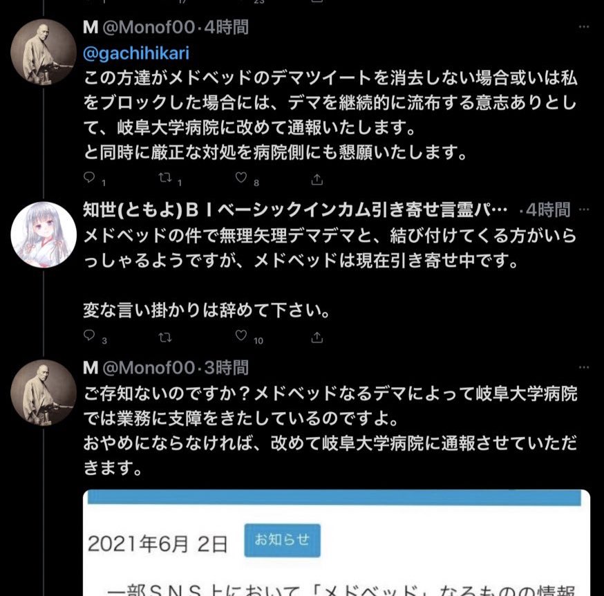 444によるメドベッドのデマ流布の件について、岐阜大学病院には既に通報しました。デマを謝罪せずにまだ続くようでしたら岐阜大学病院には改めて通報し直します。これは444のみならず444のフォロワーについても同様に通報します。