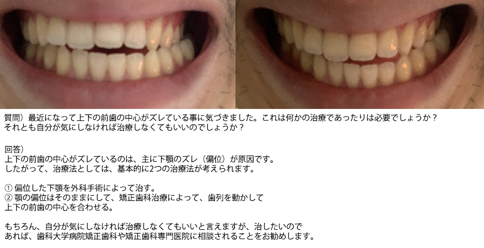 最近、上下の前歯の中心がズレている事に気づき 治療は必要でしょうか?