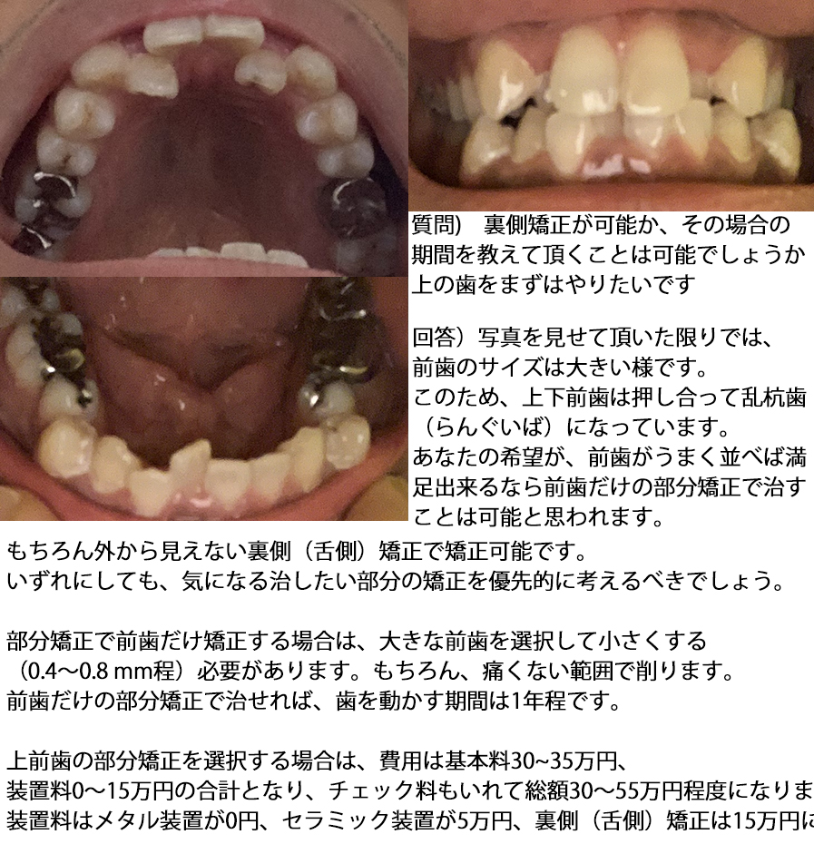上下前歯の部分矯正は可能?裏側矯正の場合、費用はいくら?28歳の男性 小谷田 仁 - 歯科医師(2018/06/13 19:32)
