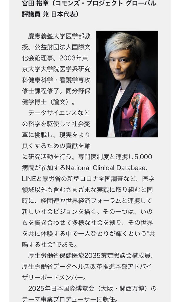 コロナでも専門家としてテレビに出演し、国際的なワクチンパスポート含む管理システム推進の日本代表が、今度の大阪万博のテーマ事業プロデューサーでもある。