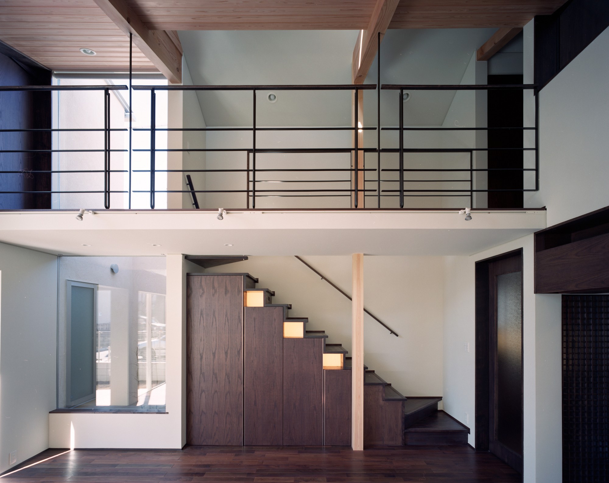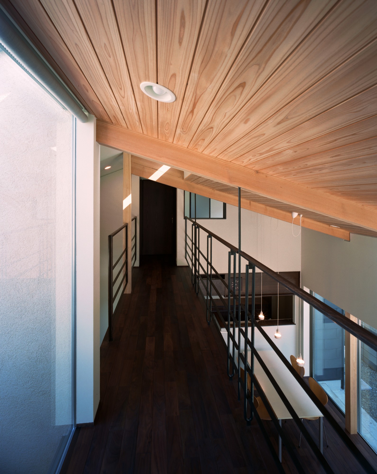 『この廊下は階段と並行して計画され、離れた個室どうしをリビングルームの上部にある廊下でつなげています。互いの個室の独立性を尊重しながら、空間全体に一体感が感じられる廊下です。』