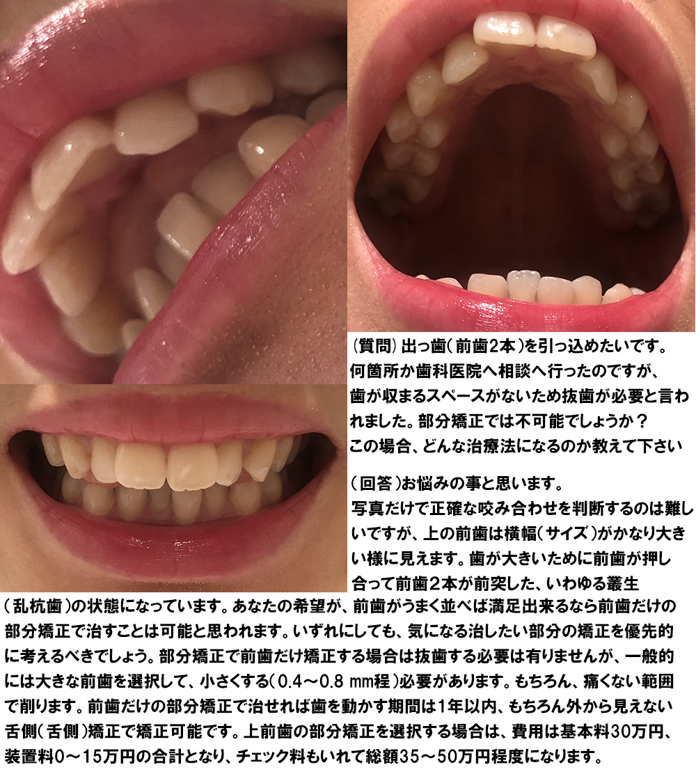 出っ歯(前歯2本)を引っ込めたく 歯科医院で抜歯が必要と言われ 部分矯正は不可能ですか?