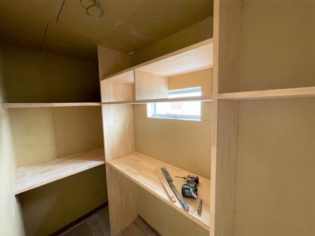 今ウォークインクローゼットや収納の棚を造っているようです。