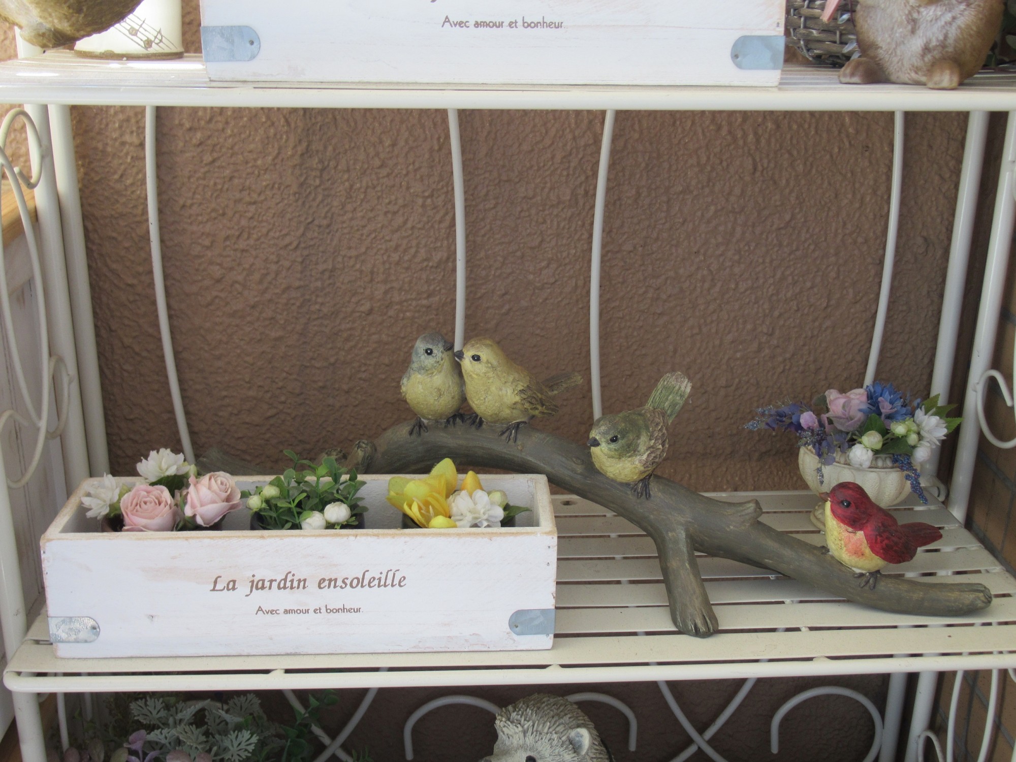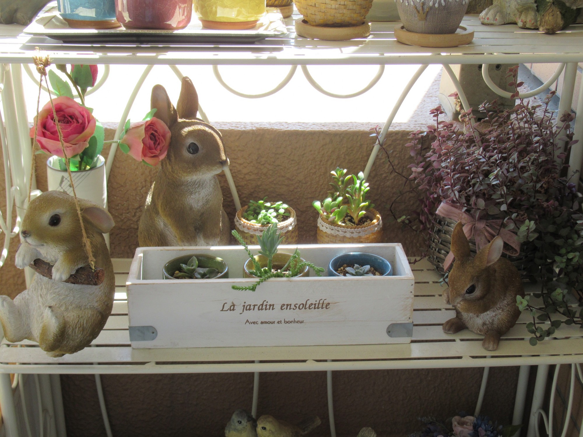 一番上の段に、現在蕾をつけているシルクジャスミンと多肉植物を飾っています♫