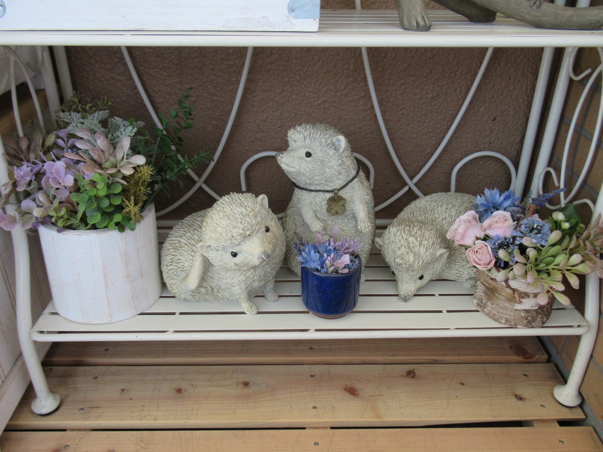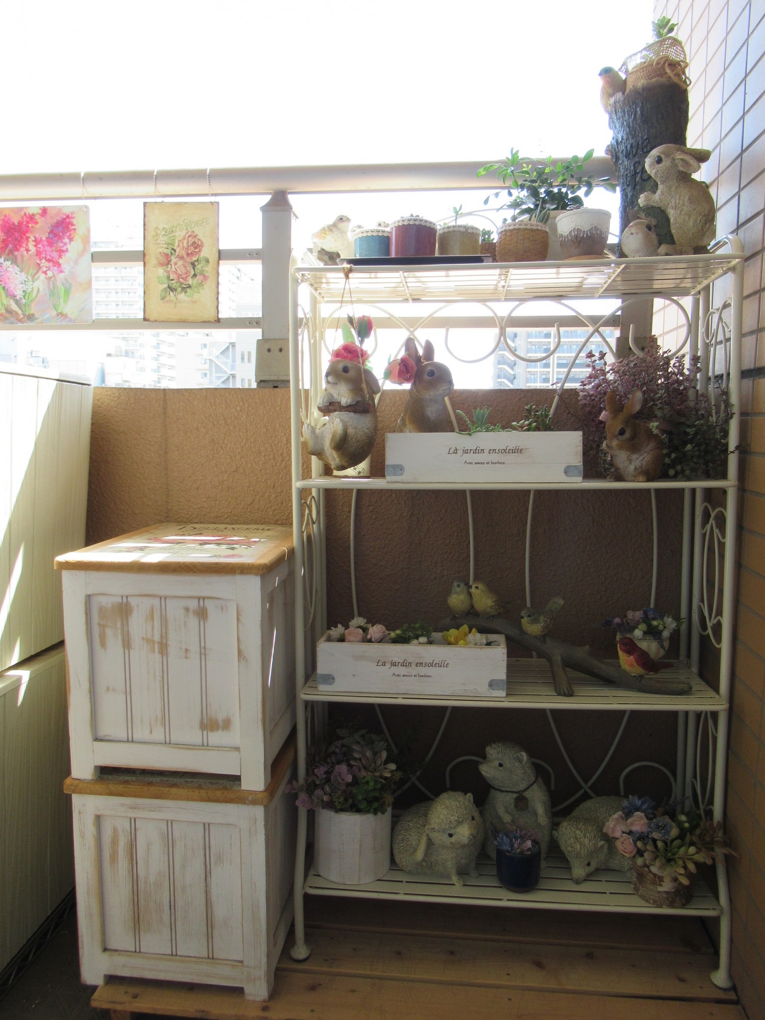 四段目は、この様に完全に日陰になってしまい、本物の植物には適さない環境の為、昔々バレエの舞台で小道具として使用した造花の余り等を無駄なく使用して楽しんでいます♫(※グリーンの葉は造花屋さんで新たに購入してコーディネートしました♡)