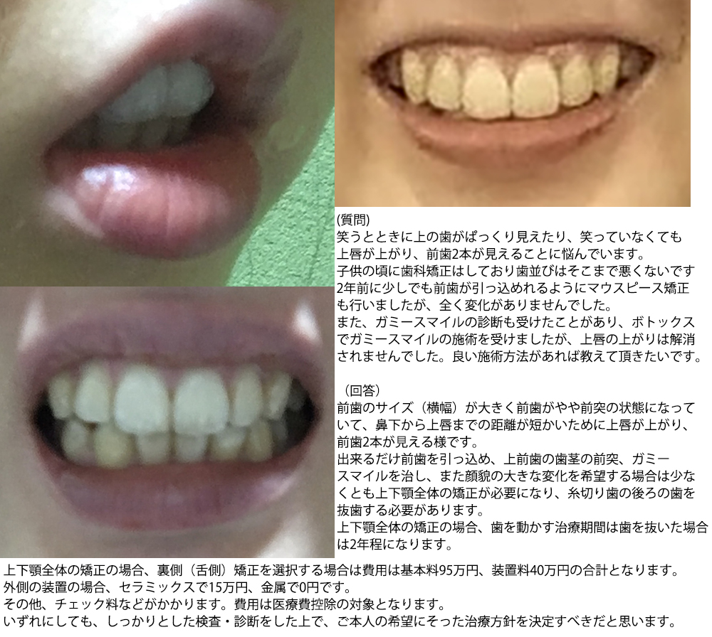前歯を引っ込める為 マウスピース矯正 変化が無く ボトックスでガミースマイル施術 上唇は解消されず 小谷田 仁 - 歯科医師(2022/09/25 13:11)