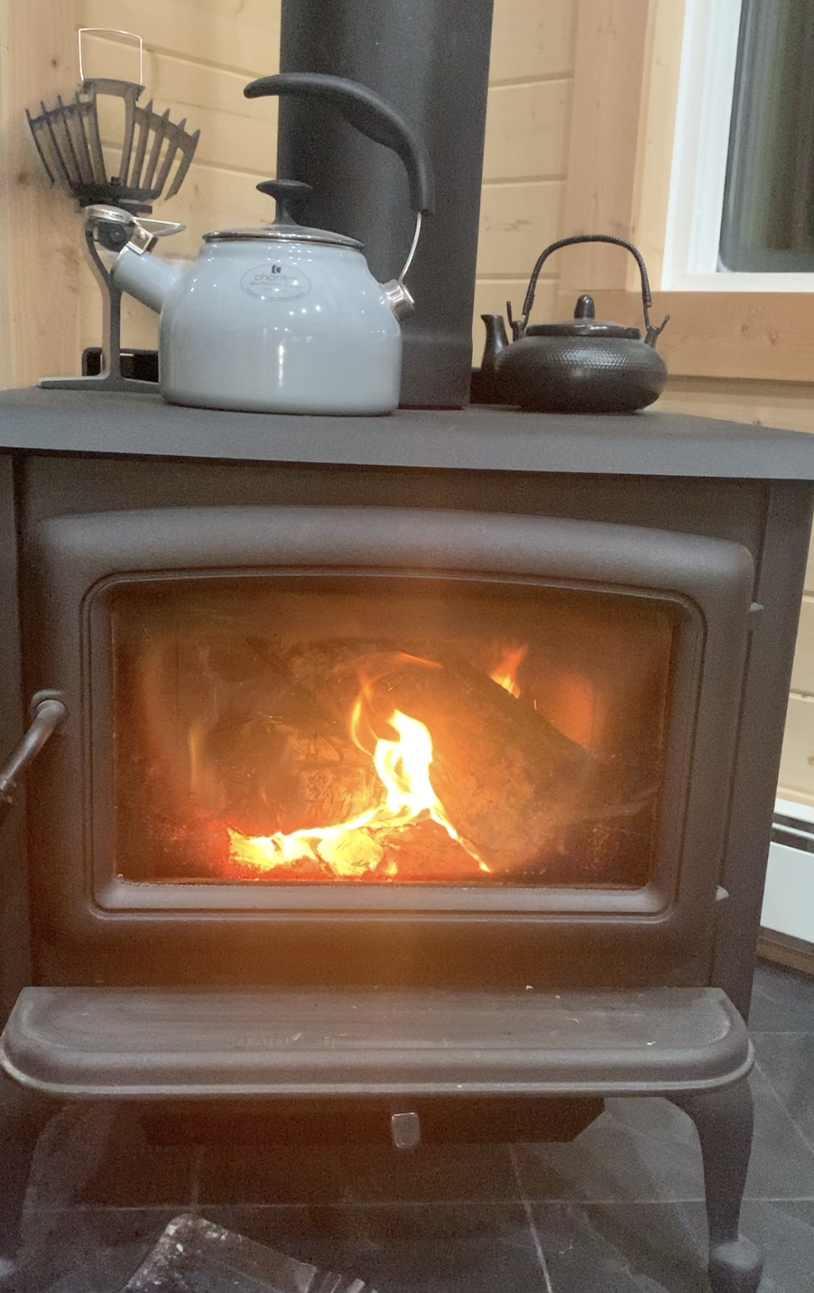 薪ストーブが豪快に暖めてくれます。