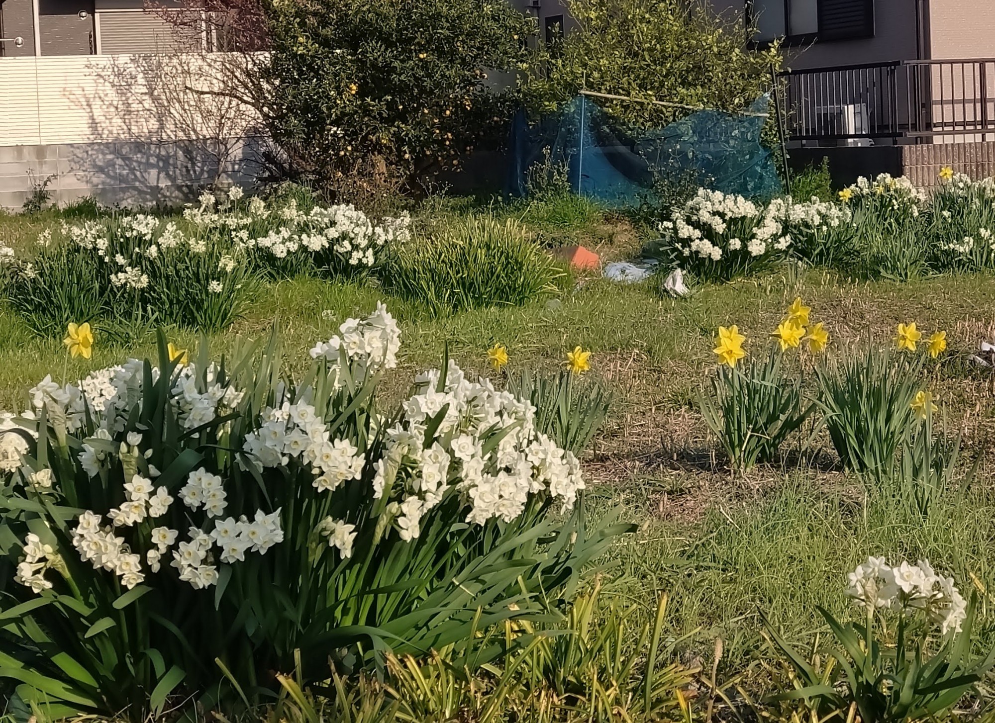 空地に咲いたスイセンとラッパスイセン。