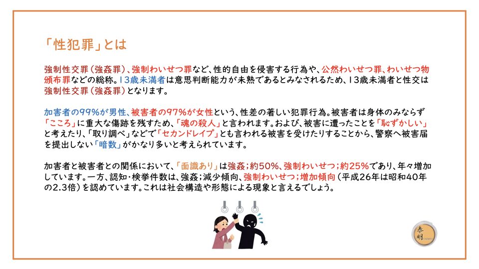 加害者の99%が男性、被害者の97%が女性という、性差の著しい犯罪行為。被害者は身体のみならず「こころ」に重大な傷跡を残すため、「魂の殺人」と言われます。および、被害に遭ったことを「恥ずかしい」と考えたり、「取り調べ」などで「セカンドレイプ」とも言われる被害を受けたりすることから、警察へ被害届を提出しない「暗数」がかなり多いと考えられています。