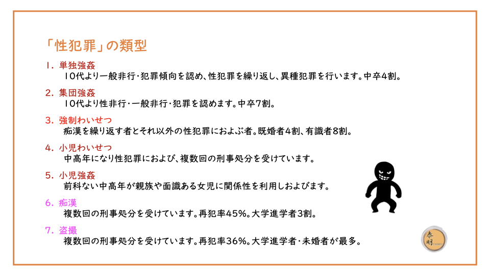 10代より一般非行・犯罪傾向を認め、性犯罪を繰り返し、異種犯罪を行います。中卒4割。