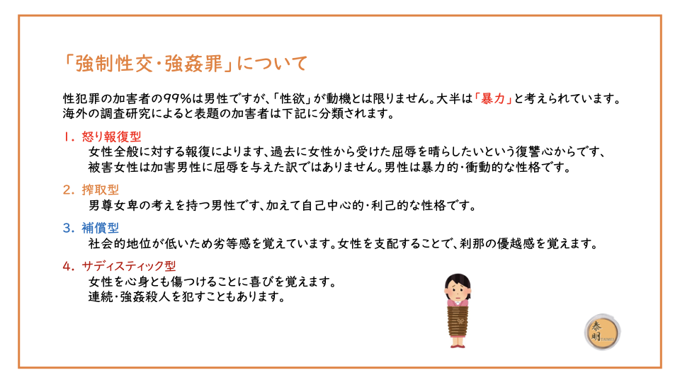 性犯罪の加害者の99%は男性ですが、「性欲」が動機とは限りません。大半は「暴力」と考えられています。海外の調査研究によると表題の加害者は下記に分類されます。
