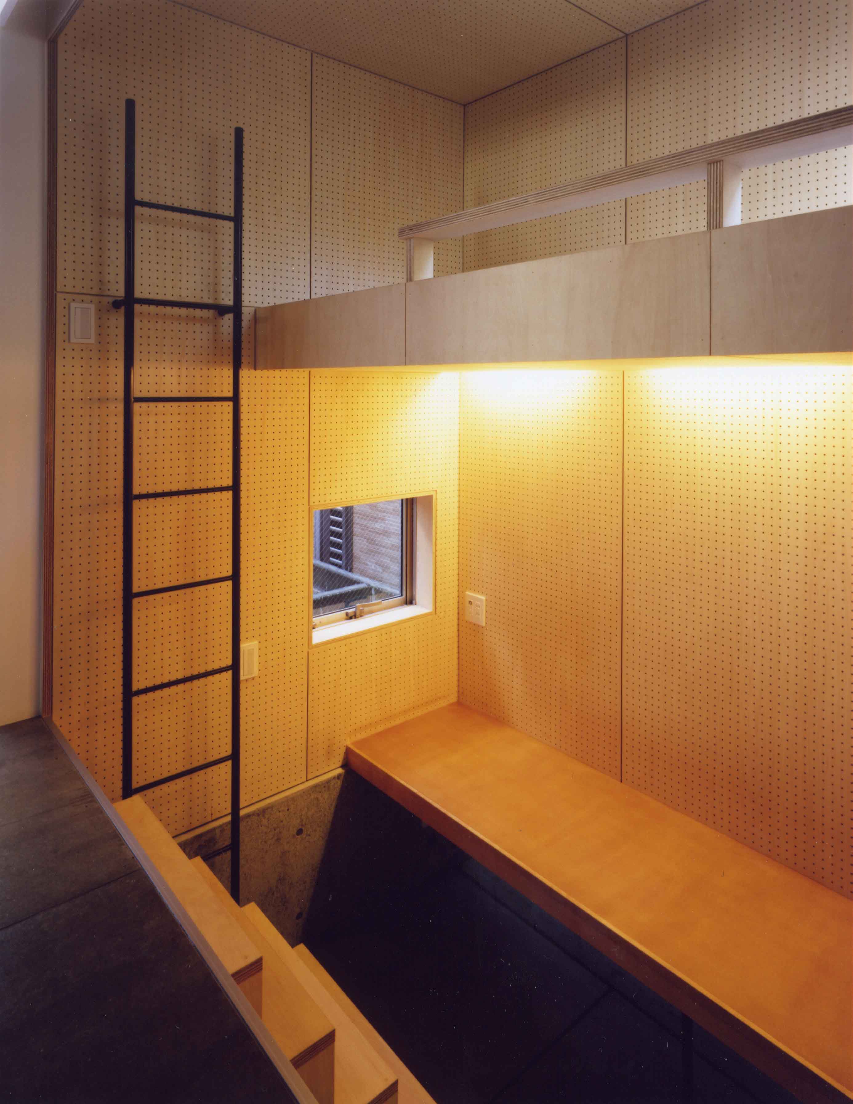 通常の天井仕上げはまず天井下地を組みそこに石膏ボードなどの下地材を貼り、最後に塗装などの仕上げを施すわけであるが、ここでは化粧梁のうえから合板を貼り、その裏側をそのまま天井仕上げとすることでコストダウンを図った。