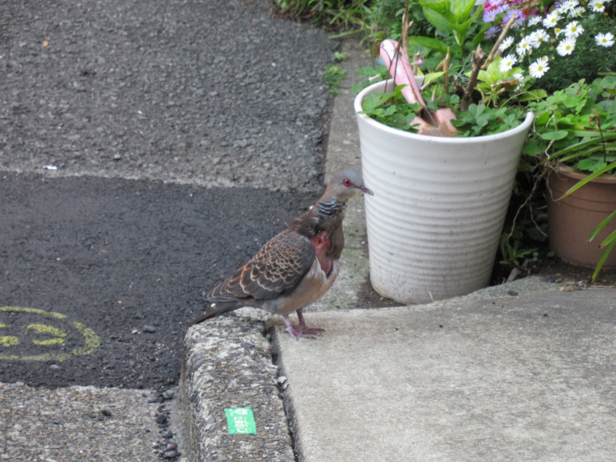 最初この子を遠くから見た時に「茶色っぽい見た事のない鳥さん」と感じたのですが、良く見ると胸の所がえぐられる様に怪我をしているらしいキジバトさんでした。