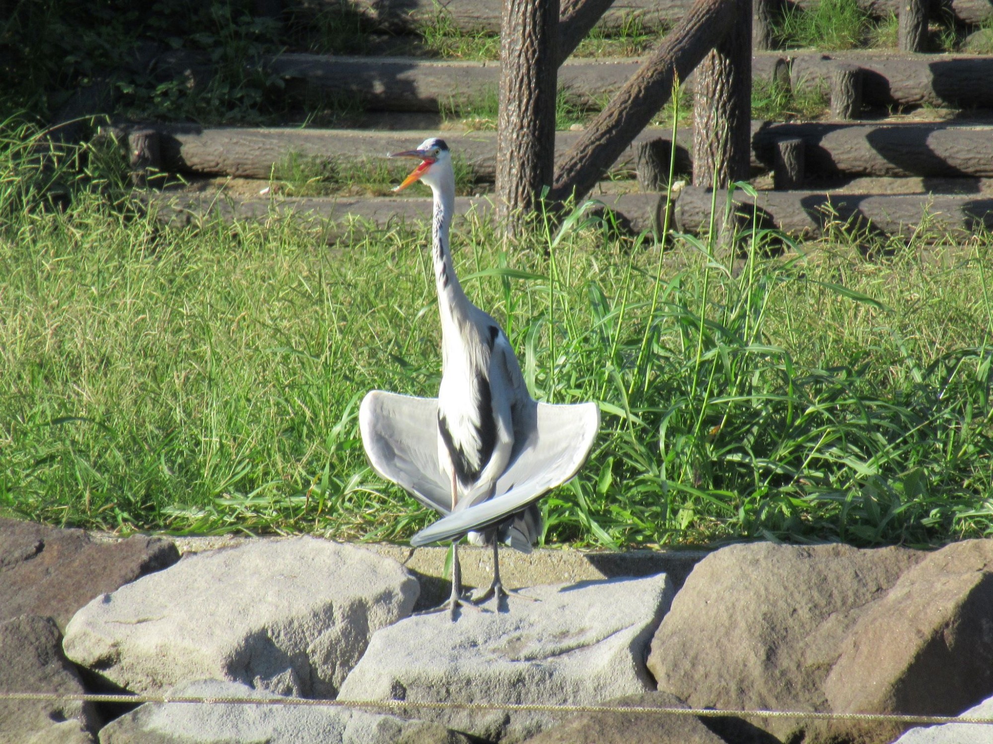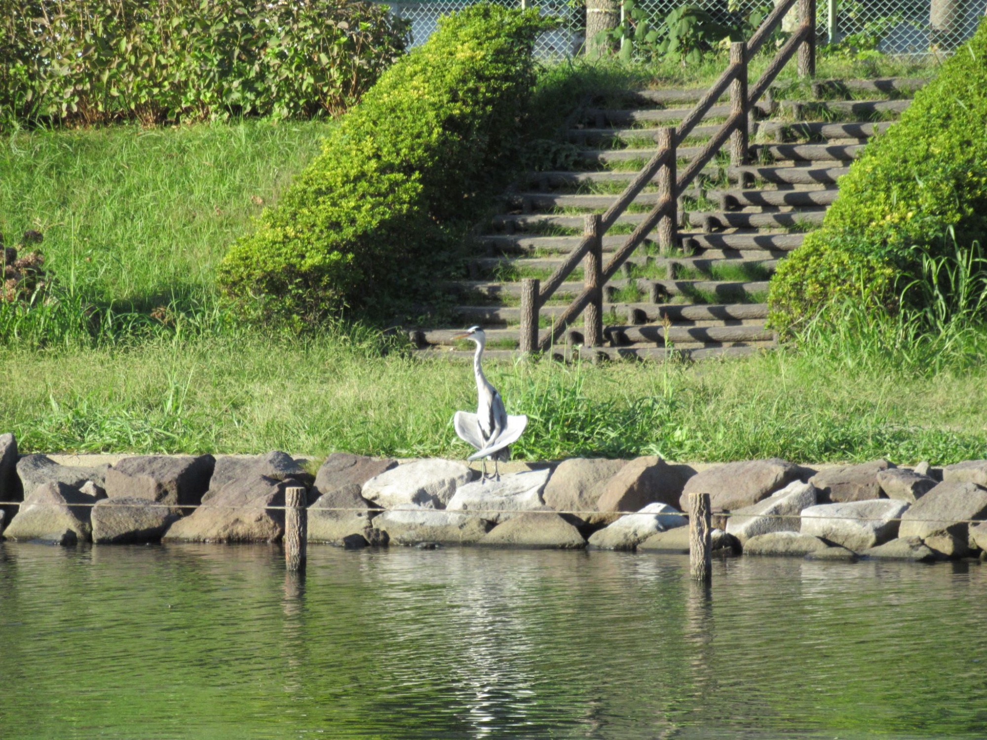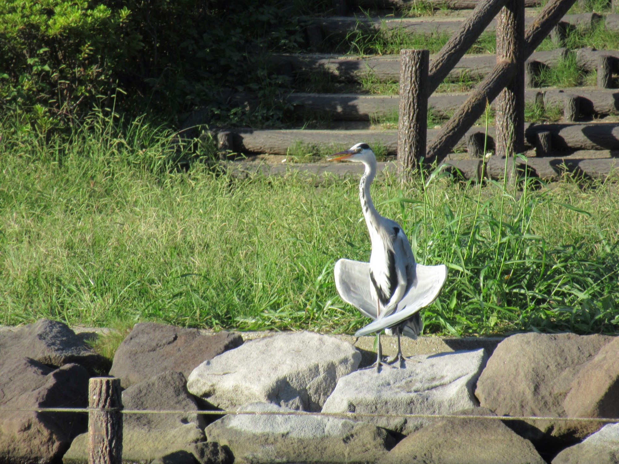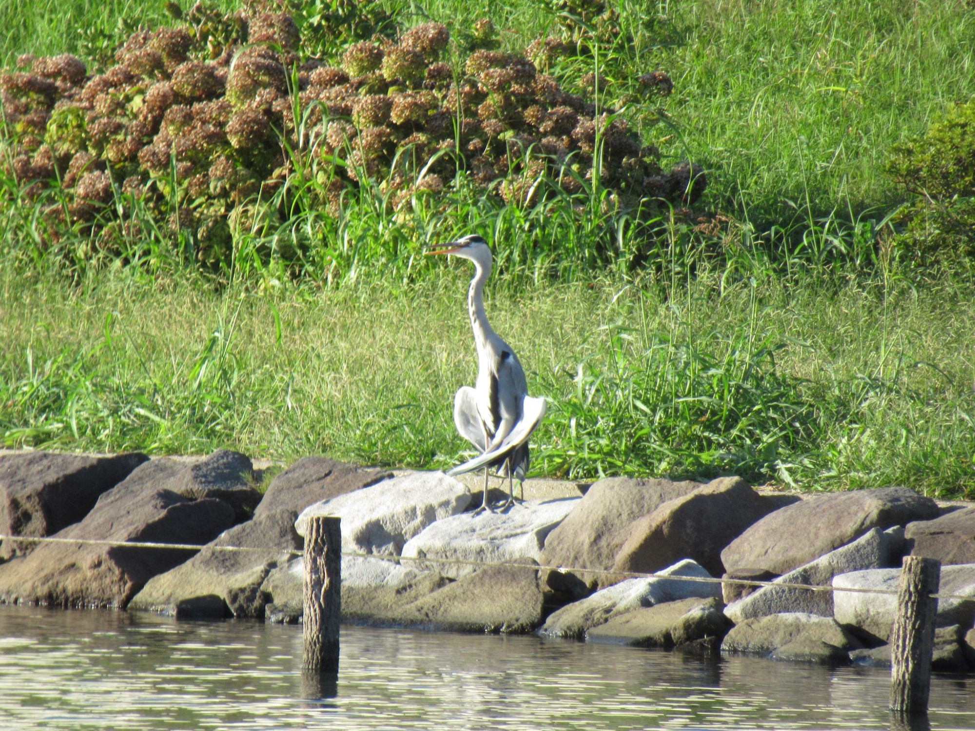 多分羽根を乾かしておられたのでしょうけれど、彼はこの格好のまま鳴いたりしながら、ここで長時間過ごされておりました。長年川沿いの道をお散歩している私ですが、こんなユニークな格好をしたアオサギさんは初めて見ました。
